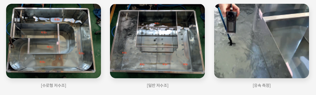 일반 도류벽 저수조와 곡면패널이 적용된 수로형 저수조의 유속 비교 시험