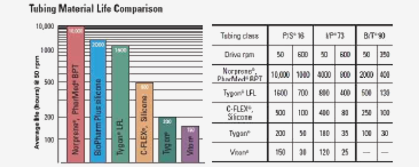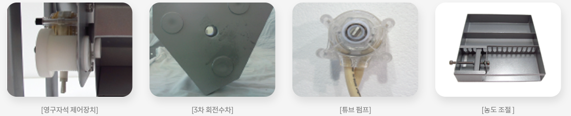 회전수차의 회전시 약품을 투입하는 튜빙호스가 내구성 때문에 수명이 짧은 실리콘, C-FLEX를 대신하여 월등한 수명(20배)의 PharMed 사용한다.